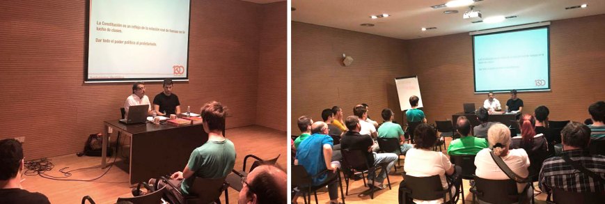 A continuación tomó la palabra el camarada Joseba Angulo (de la Coordinadora Central de la Comisión Octubre), que se ocupó de desgranar más pormenorizadamente y de una manera ágil y didáctica —valiéndose además de la proyección de una presentación— los hitos principales en materia constitucional en la Rusia soviética y en la URSS, desde la primera de la Carta Magna que se aprobó en Rusia tras el triunfo revolucionario (1918) hasta la última de las constituciones soviéticas (aprobada en 1977), sin olvidar las constituciones soviéticas de 1924 y 1936. Se resaltaron las bases fundamentales de cada uno de esos textos y el contraste entre éstos y las constituciones liberales y cómo, a diferencia de éstas, las constituciones soviéticas realmente se regían por una coherencia entre lo que declaraban sus artículos y la práctica política para la aplicación de los mismos —más allá de meras declaraciones de derechos—, así como en qué medida las constituciones soviéticas reflejaban hasta qué punto y con qué celeridad la clase trabajadora logró progresar en cuanto a derechos legalmente reconocidos y efectivamente aplicados.