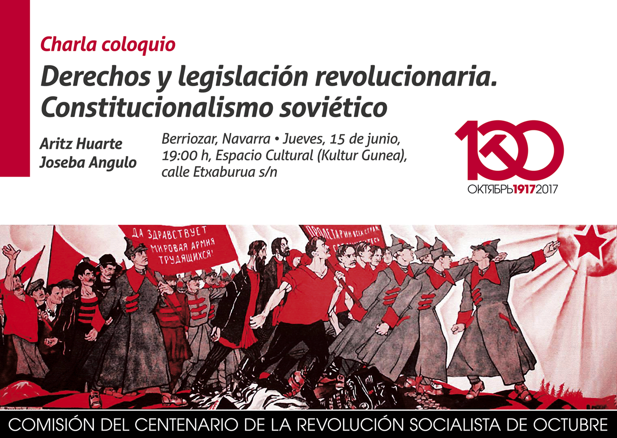 El Espacio Cultural/Kultur Gunea de Berriozar acogió —el 15 de junio del año del Centenario de la Revolución Socialista de Octubre— el tercero de los eventos que ha organizado la Comisión Octubre en Navarra (el cuarto en Euskal Herria). En una sala que rozó el lleno, con 37 personas presentes (la mayoría de ellas muy jóvenes), el camarada Aritz Huarte, en nombre de la Coordinadora Territorial de la Comisión Octubre en Navarra, realizó la presentación de la charla-coloquio “Derechos y Legislación Revolucionaria. Constitucionalismo Soviético”, sintetizando algunos de los aspectos más relevantes en cuanto a avances políticos, sociales y legislativos que se registraron, primero en Rusia y posteriormente en la Unión Soviética, entre la Revolución Socialista de Octubre de 1917 y 1991.