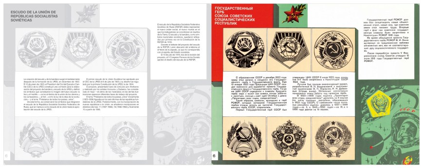Las láminas originales están divididas en tres bloques temáticos: “Bandera de la URSS”, “Escudo de la URSS” e “Himno de la URSS”. Para conservar el carácter original del trabajo, se reproducen los pósters tal como se imprimieron en 1990, en lengua rusa, razón por la que en páginas contiguas a las láminas se muestra la correspondiente traducción al castellano. Se trata de una libro en gran formato: 30 x 23,5 cm; con 32 pp. más cubierta impresas en cuatricomía.
