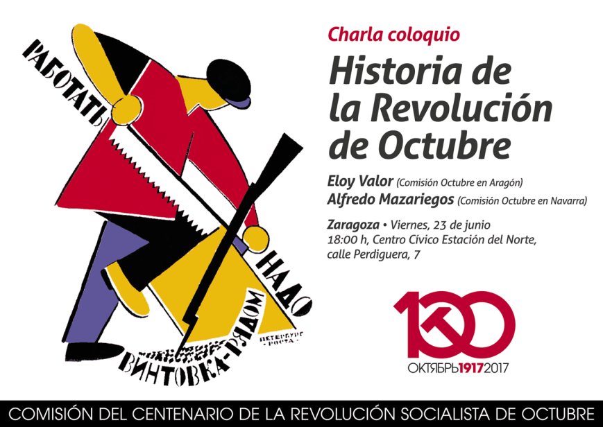 El pasado viernes, 23 de junio del año del Centenario, tuvo lugar en Zaragoza, en el Centro Cívico Estación del Norte de la capital maña, una charla coloquio sobre la Historia de la Revolución dentro de los actos temáticos programados por la Comisión Octubre en todo el país y, en concreto, en la comunidad autónoma de Aragón, para conmemorar el Centenario de la Revolución Socialista de Octubre.