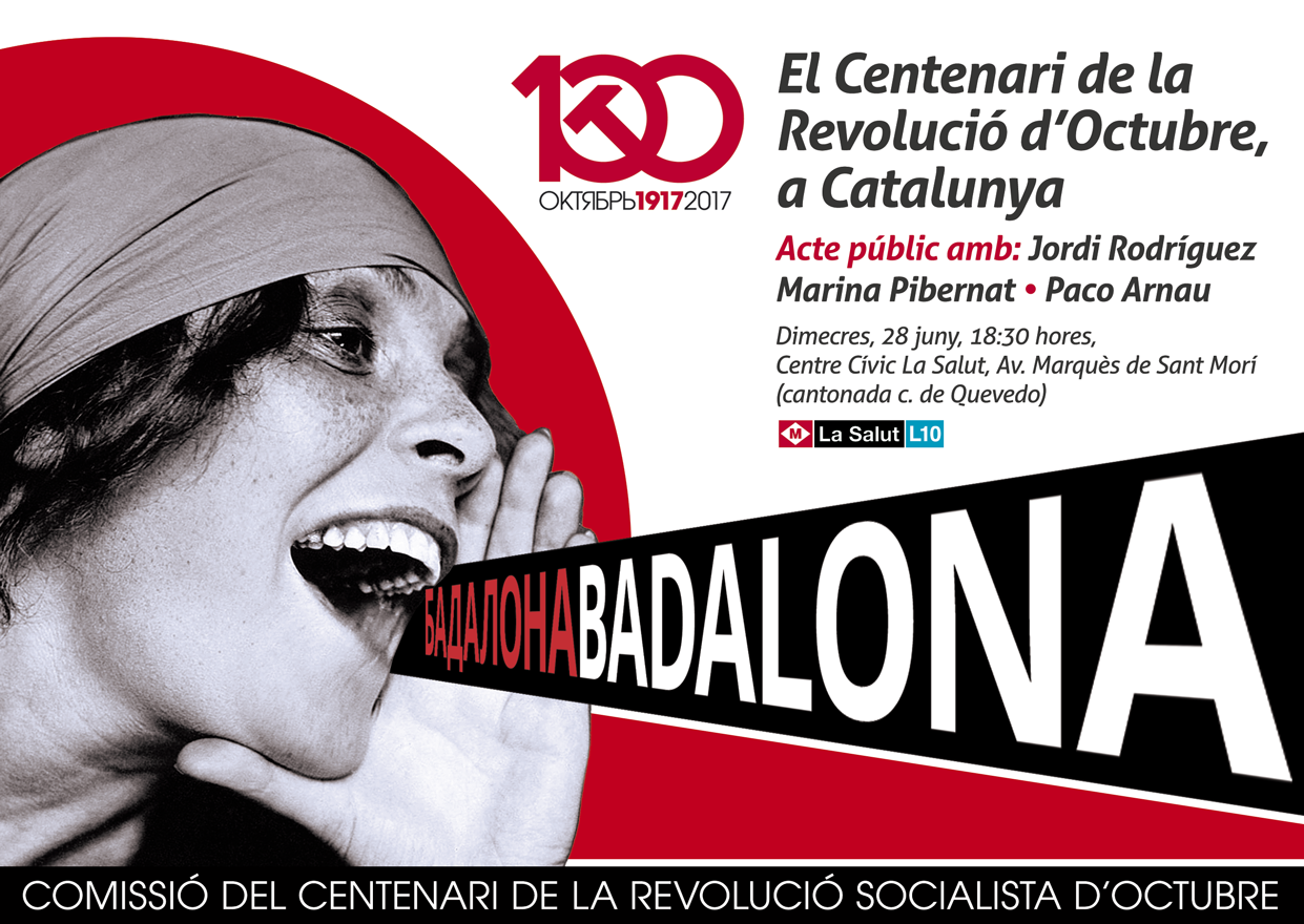 El miércoles, 28 de junio del año del Centenario, se ha celebrado en la ciudad obrera de Badalona el primer acto público en tierras catalanas de la Comissió del Centenari de la Revolució Socialista d’Octubre. El acto, convocado bajo el título «El Centenari de la Revolució d’Octubre, a Catalunya», contó con la participación de más de una treintena de asistentes, tanto de Badalona como procedentes de otras localidades de Cataluña. Se inició el evento con un saludo de apertura a todos los presentes por parte de Jordi Rodríguez, militante de la Comissió Octubre en Badalona, quien además presentó a los otros dos ponentes en la mesa.