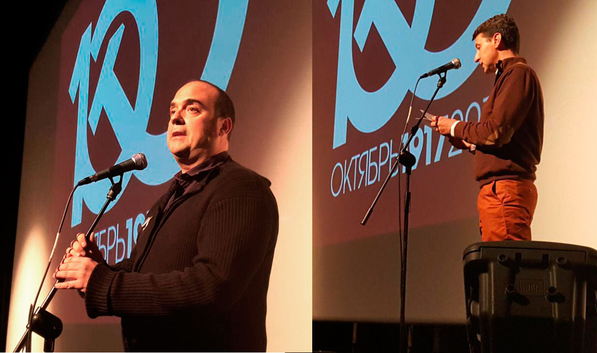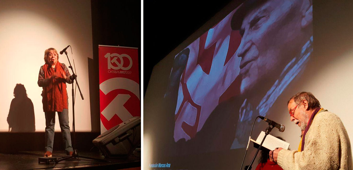 Además de lo reseñado, hubo lecturas de poemas de nuestros clásicos, Miguel Hernández, Pablo Neruda, Maiakosvki y Roque Dalton, dedicados a la Revolución y declamados por la presentadora y conductora del Acto, Susana Oviedo. Fueron proyectados todos los vídeos realizados por la Comisión Octubre durante el año del Centenario. Finalmente, cerramos el Acto Central cantando ‘La Internacional’. Seguimos.