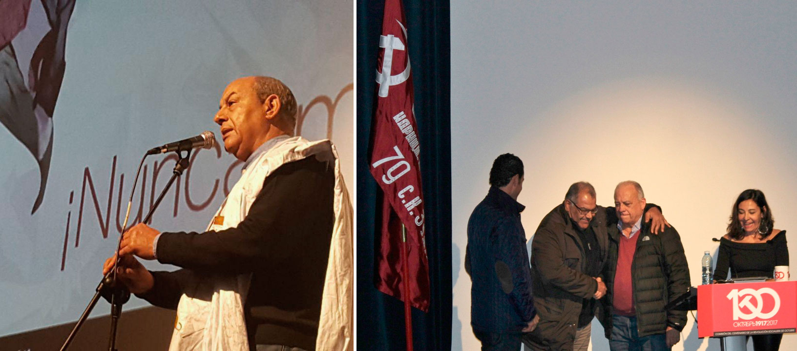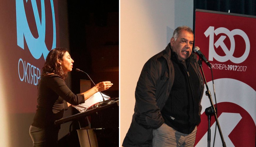 El acto contó con la asistencia de más de trescientos compañeros y compañeras —procedentes de la Comunidad de Madrid, Navarra, Aragón, Cataluña, País Valenciano, Castilla y León, Castilla-La Mancha y Andalucía—, estructurado en cuatro bloques. El primero de ellos estuvo dedicado a la solidaridad internacionalista, uno de los puntales de la Revolución de Octubre. Contamos con la presencia y el saludo de los representantes en España del Gobierno Sirio, que mantiene un combate heroico contra la agresión imperialista y el terrorismo yihadista, en cuyo nombre intervino el compañero Mushen Bilal; a continuación tomó la palabra el compañero Yamil Kaser, en nombre de la Autoridad Nacional Palestina, destacando la lucha mantenida durante décadas por el sufrido y bravo pueblo palestino; luego le llegó el turno al embajador de la República Bolivariana de Venezuela, Mario Isea, que levantó al público asistente de sus asientos, con un discurso vibrante; y cerrando el capítulo de la solidaridad internacional, habló Abidin Bucharaya Yama, en representación de la Delegación Saharaui en Madrid.